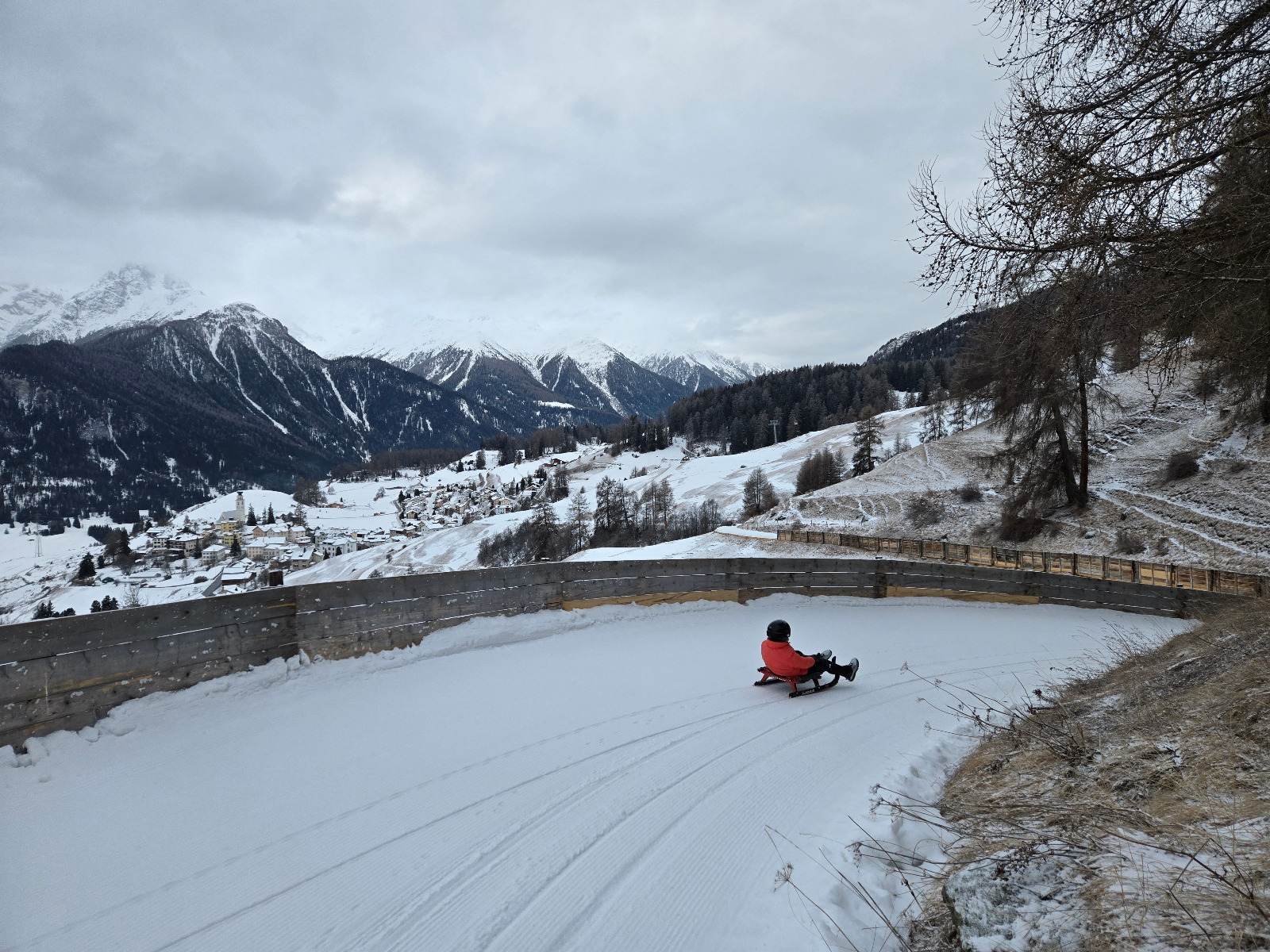 Ein echtes Highlight war dann die Rodelbahn in Ftan bei Scuol (etwa 35min Anreise v. Nauders). Ein kleines, familiäres Skigebiet. Eine (beheizte) 4-Sesselbahn bringt einen zügig zum Start der Bahn. Das Liftpersonal zeigte sich auch recht einfühlsam beim Rodel-Handling. Die Bahn bietet eine nahezu perfekte Kombination aus steilen Stücken, engen Kurven, Kurven mit Kompression, leichtem Geschlängel und erholsamen Geraden. Und endet direkt an der Liftstation.
